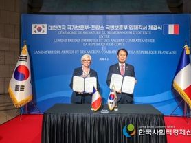 한국사회적경제신문 claire-shin 기자 | 한국·프랑스 수교 140주년과 지평리 전투 75주년을 맞아 양국 국방보훈부가 6·25전쟁 참전용사의 공헌과 희생에 대한 예우 등 보훈을 통한 양국 교류와 협력 강화에 나서기로 했다. 국가보훈부는 권오을 국가보훈부 장관이 지난 2일 전쟁기념관에서 카트린 보트랭 국방보훈부 장관과 '국제보훈협력에 대한 양해각서'(MOU)에 서명했다고 3일 밝혔다. 이번에 체결된 양해각서는 지난 2023년 보훈사업 협력의향서(LOI)를 한 단계 더 확대하고 구체화한 것으로 ▲ 프랑스 참전 역사와 참전용사에 대한 기록수집·공유 ▲ 참전용사 및 유가족 예우 ▲ 참전용사의 헌신을 기리고 전사자 추모 기념시설 협력 ▲ 후손과 미래세대를 위한 교류·협력 사업 ▲ 학술·교육·문화사업 ▲ 한국의 독립운동 관련 기록 수집 등에 대해 상호 협력할 계획이다. 특히 이날 양해각서 체결식에는 6·25전쟁 당시 프랑스대대 소속으로 참전한 이병선 참전유공자(90세)도 함께해 의미를 더했다. 아울러 양국 사관생도들도 체결식에 참석, 6·25전쟁으로 인한 인연을 미래세대가 이어가겠다는 의미를 부여했다.