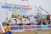 한국사회적경제신문 김태훈 기자 | 전남 나주시가 본격적인 영농철을 앞두고 농업인의 화합과 결속을 다지며 풍년 농사를 기원하는 영농발대식을 개최했다. 나주시는 지난 25일 영산강둔치체육공원에서 ‘2026년 농업인 영농발대식’을 열고 한 해 농사의 시작을 알렸다고 26일 밝혔다. 이번 행사는 나주농민회(회장 박용래)와 나주시여성농민회(회장 송숙희)가 공동 주관했으며 지역 농업인과 시민 등 1500여 명이 참석해 새로운 농사의 출발을 함께했다. 영농발대식은 매년 영농철을 앞두고 농업인의 무사 안녕과 풍년을 기원하고 영농 의지를 다지는 나주시 대표 농업 행사로 자리잡고 있다. 특히 기후변화와 농자재 가격 상승, 농촌 고령화와 인력 부족 등 어려운 여건 속에서 농업인의 사기를 높이고 지속 가능한 농업 발전 의지를 다지는 의미를 더했다. 이날 행사는 풍물패 길놀이 공연을 시작으로 나주시립국악단 축하공연과 고천제가 이어지며 한 해 풍년과 농업인의 안녕을 기원했다. 기념식에서는 농민회장과 여성농민회장의 대회사와 함께 전농 광주전남연맹 의장의 격려사, 농업 발전과 농민 권익 향상을 위한 결
