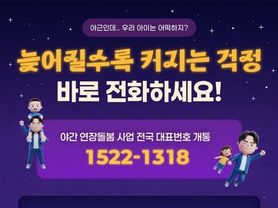 한국사회적경제신문 claire-shin 기자 | 야근인데… 우리 아이는 어떡하지? 늦어질수록 커지는 걱정 바로 전화하세요! ■ 야간 연장돌봄 사업 전국 대표번호 개통 '1522-1318' · 6~12세 아동 누구나 이용 가능 · 전국 343개 돌봄시설 운영 중 · 평일 18시~22시 또는 24시까지 이용 가능 · 가까운 지역 상담센터 자동 연결 · 2시간 전 신청 가능(긴급 이용 OK) 국번 없이 ☎1522-1318을 누르면 지역 상담센터로 자동 연결되어 가까운 이용 가능 센터를 안내받을 수 있습니다.