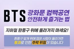 한국사회적경제신문 claire-shin 기자 | BTS 광화문 컴백공연 안전하게 즐기는 법 ■ 지하철 환풍구 위에 올라가지 마세요! 환풍구 덮개 위에 많은 사람이 올라가면 붕괴로 인한 추락 위험이 있습니다. ■ 주변 건물이나 높은 곳에 올라가지 마세요! 공연 당일 주변 건물 출입 통제 예정 ■ 공연 당일 인파 밀집 시 즉시 대피하세요! 떠밀리는 느낌이 들면 즉시 벗어나 ☎112나 ☎119에 신고