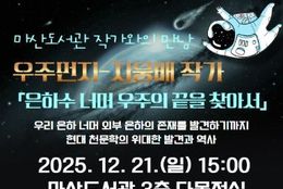 한국사회적경제신문 기자 | 김포시 마산도서관은 오는 12월 21일 오후 3시, 지웅배 작가와의 만남 프로그램을 3층 다목적실에서 진행한다. '우리는 모두 천문학자로 태어난다', '갈 수 없지만 알 수 있는', '날마다 우주 한 조각' 등을 집필한 지웅배 작가는 현재 세종대학교 교수로 재직 중이며, 유튜브 채널 ‘우주먼지의 현자타임즈’를 운영하는 유튜버로도 활발히 활동하고 있다. 이번 지웅배 작가와의 만남에서는 ‘은하수 너머 우주의 끝을 찾아서’ 라는 주제로, 우리 은하 너머 외부 은하의 존재를 발견하기까지 현대 천문학의 위대한 발견과 역사에 대해 이야기해 볼 예정이다. 프로그램은 김포시 청소년~성인 70명을 대상으로 12월 21일 일요일 15시부터 마산도서관 3층 다목적실에서 진행되며, 11월 24일 오전 10시부터 신청이 가능하다. 김포시 마산도서관 홈페이지 문화행사 신청(모집/행사 부분)을 통한 온라인 신청과 마산도서관 1층 통합데스크 현장신청으로 진행할 예정이며 자세한 사항은 마산도서관 홈페이지를 참고하거나 마산도서관으로 문의하면 된다. [뉴스출처 : 경기도 김포시]